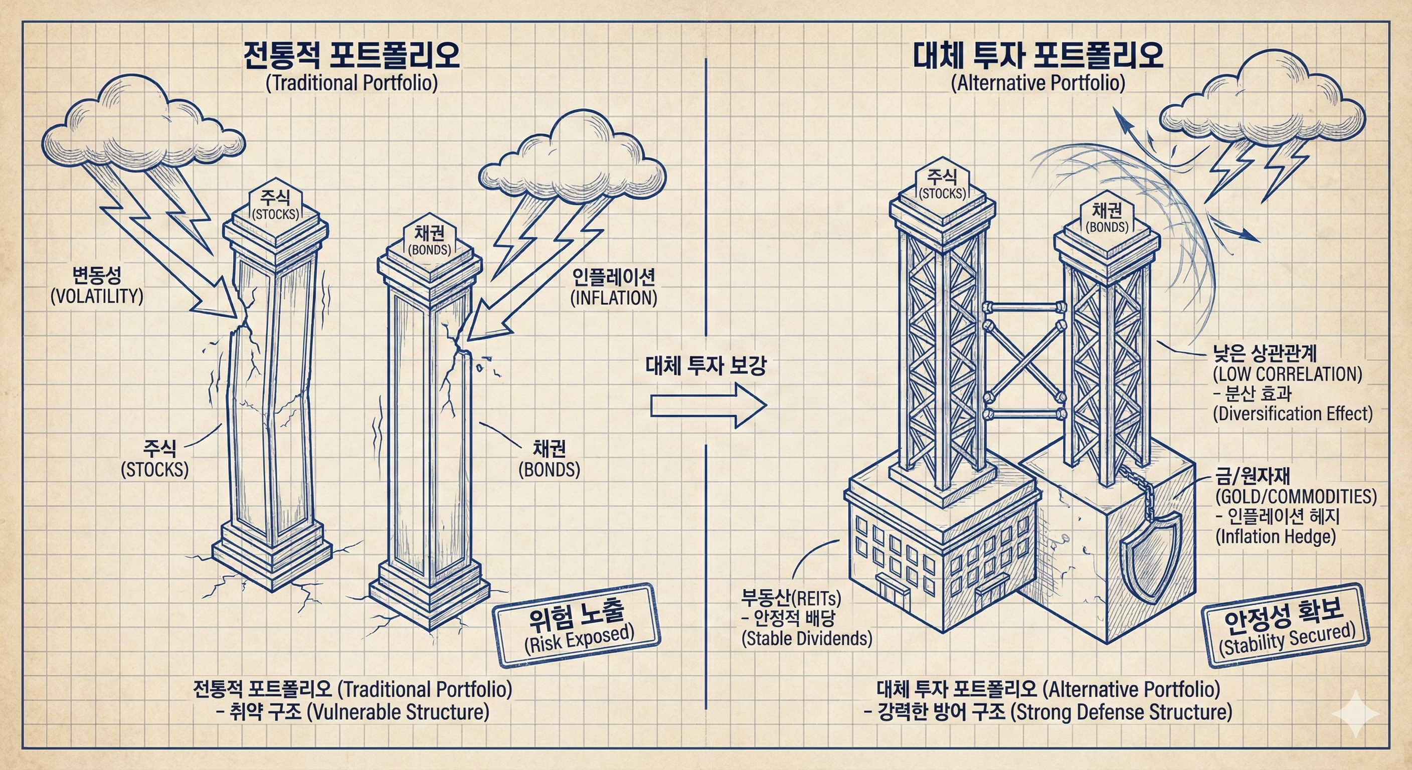 Complication (문제): 주식과 채권이 동시에 하락하는 극심한 시장 위기나, 인플레이션이 급등하는 시기에는 전통적인 포트폴리오만으로는 투자금의 구매력을 방어하기 어렵고, 분산 효과가 크게 감소하여 변동성이 높아지는 문제가 발생합니다.