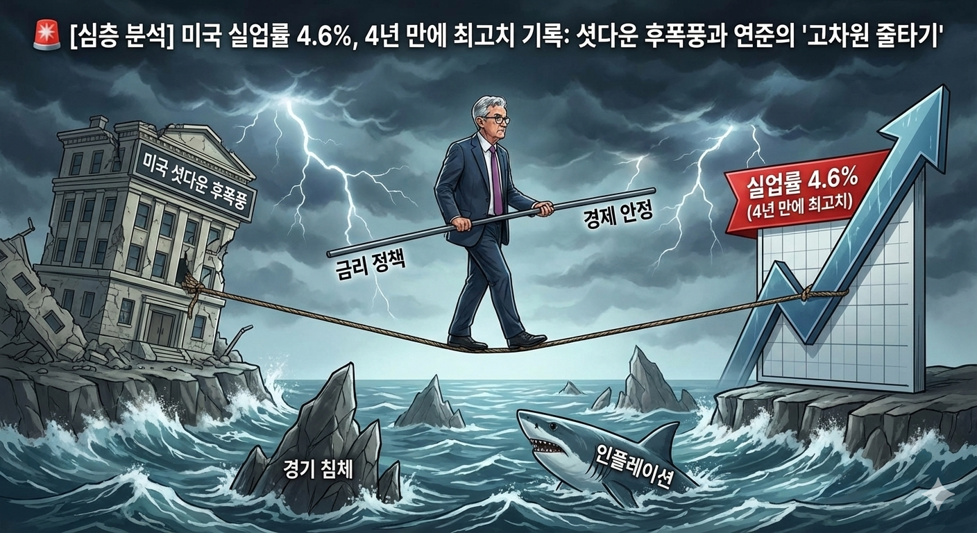 미국 노동 시장이 예상치 못한 충격에 직면했습니다. 10월부터 11월에 걸쳐 역대 최장인 43일간 지속된 **연방정부 셧다운(일시 업무 정지)**의 여파로 미국 고용 상황이 급격히 악화된 것으로 나타났습니다. 11월 실업률은 4.6%를 기록하며 지난 2021년 9월 이후 약 4년여 만에 최고 수준을 찍었습니다.