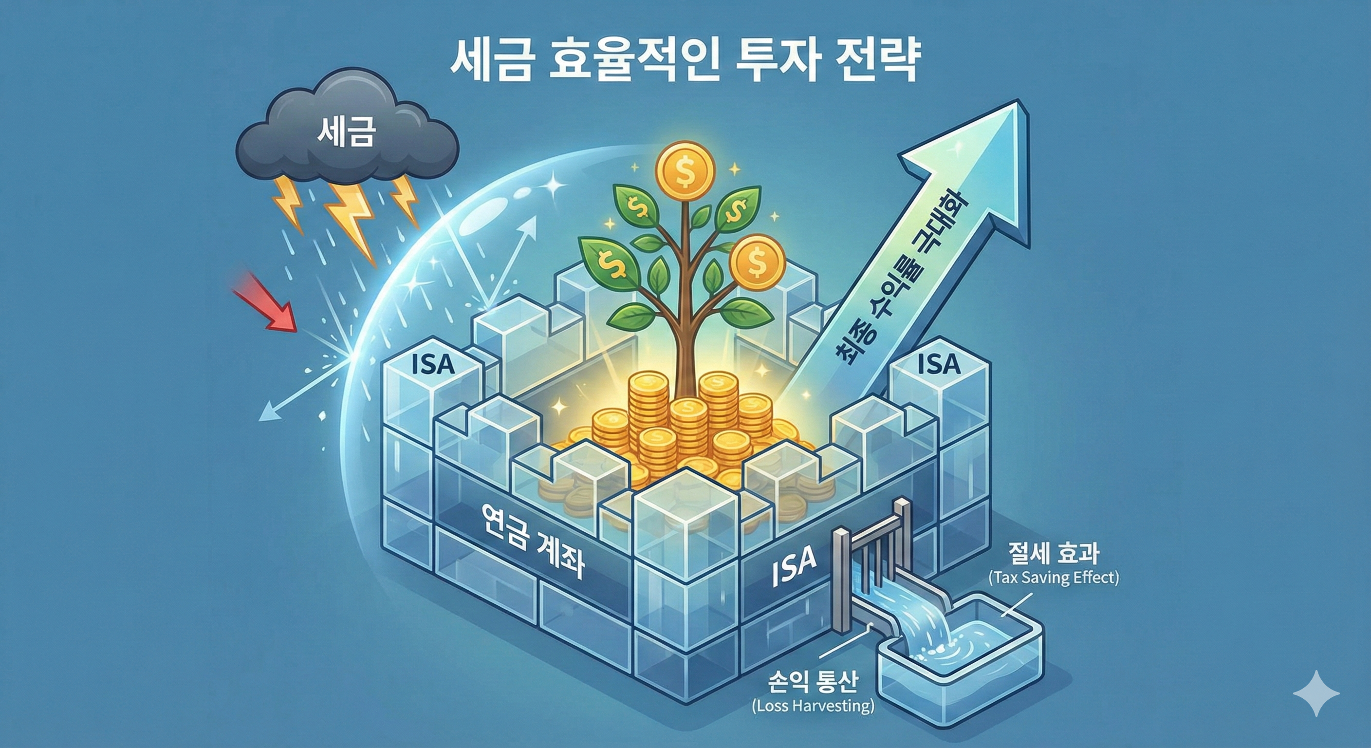 Complication (문제): 그러나 투자 수익이 발생하는 순간, 이자/배당소득세, 양도소득세 등 세금이 부과되어 실제 손에 쥐는 최종 수익률은 크게 줄어들고 복리 효과마저 훼손됩니다. 수익률의 숨겨진 적은 바로 세금입니다.