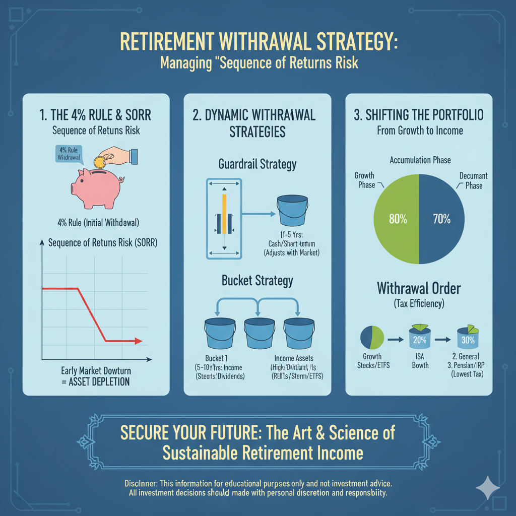 Answer (답변): 은퇴 자산의 지속 가능성을 보장하는 핵심 전략은 (1) 4% 규칙과 '수익률의 순서 위험'에 대한 정확한 이해, (2) 시장 상황에 따라 인출액을 조절하는 동적 인출 전략 적용, 그리고 (3) 은퇴 포트폴리오의 구조를 '성장'에서 '현금 흐름' 중심으로 재조정이라는 세 가지 핵심 요소를 통해 완성됩니다.