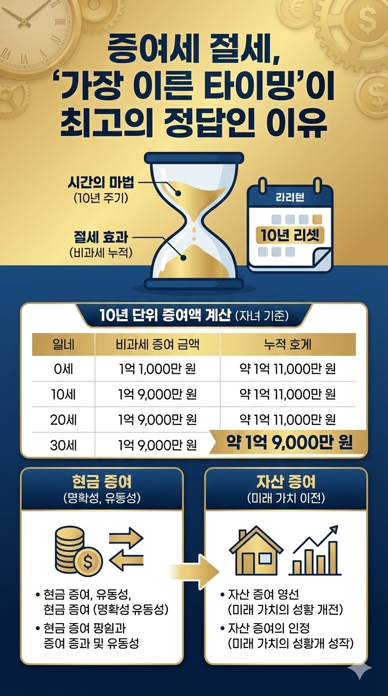 증여세(贈與稅)는 부의 대물림 과정에서 발생하지만, 계획적인 전략을 통해 합법적으로 세금을 절감할 수 있는 대표적인 '계획 세금'입니다. 수많은 절세 전략 중에서도 가장 강력하고 기본적인 원칙은 바로 **'가장 이른 타이밍(Early Timing)'**에 증여를 시작하는 것입니다. 왜 타이밍이 증여세 절세의 최고의 정답이 되는지, 그리고 어떤 전략을 세워야 하는지 분석합니다.