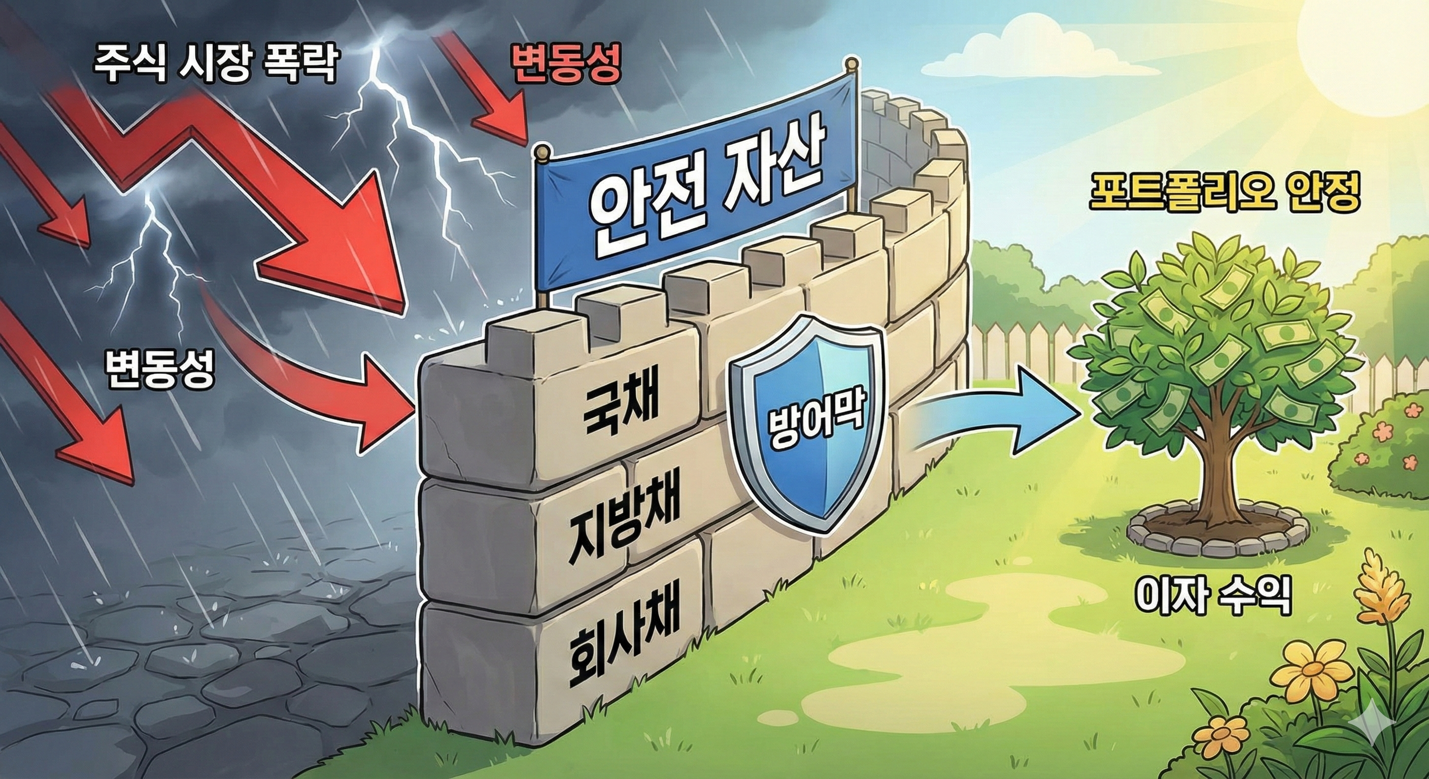 채권은 일반적으로 주식보다 변동성이 낮아, 시장이 하락할 때 포트폴리오의 손실을 방어해 주는 **'안전 자산'**의 역할을 합니다. 특히, 주식 시장이 폭락할 때 채권 가격은 오히려 오르는 역의 상관관계를 갖는 경우가 많아, 자산 배분 전략의 핵심 구성 요소로 활용됩니다.