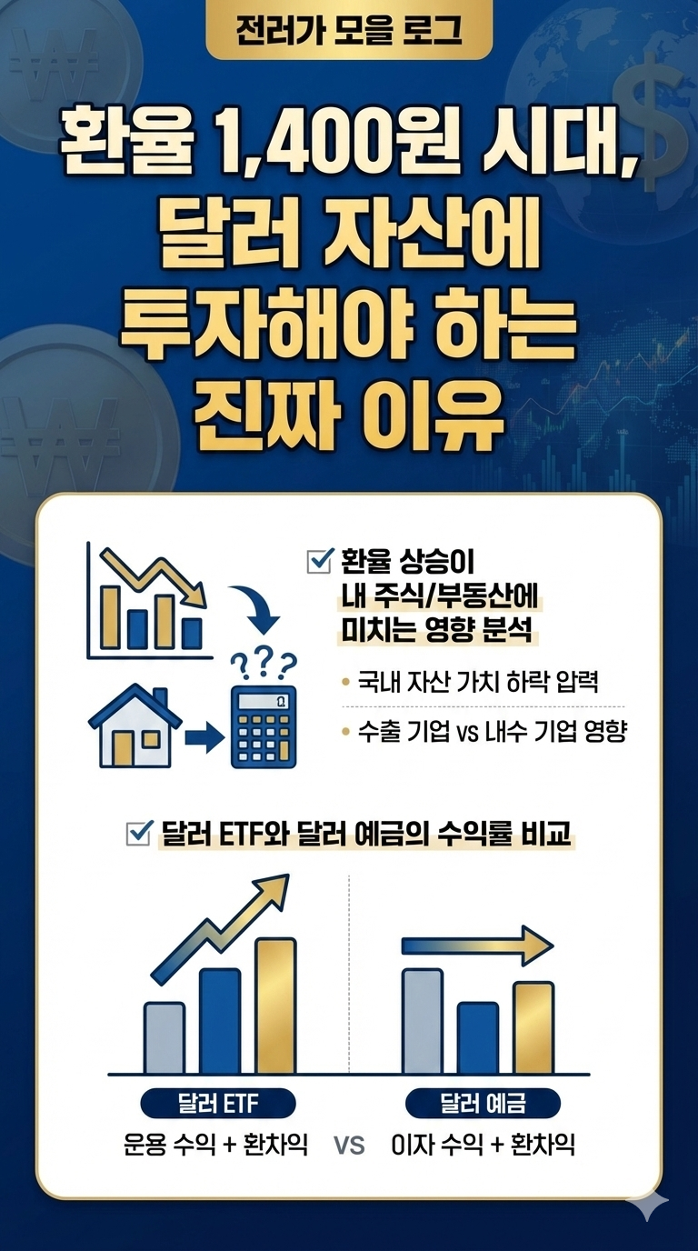 환율 1,400원 시대에 달러 투자는 단순한 재테크를 넘어섭니다. 이는 나의 자산이 국내 경제 환경에만 갇히지 않고, 언제든 세계 최고의 자산 시장(미국)에 참여할 수 있는 **'선택의 자유'**를 확보하는 행위입니다. 고환율 시기는 원화를 달러로 저렴하게(달러 기준으로는 비싸게) 매입할 수 있는 기회가 되며, 이 달러를 통해 글로벌 시장의 성장 과실을 누릴 수 있는 교두보를 마련하는 것입니다. 포트폴리오의 안정성과 성장성을 동시에 추구하는 스마트한 투자자에게 달러 자산은 필수적인 핵심 요소입니다.